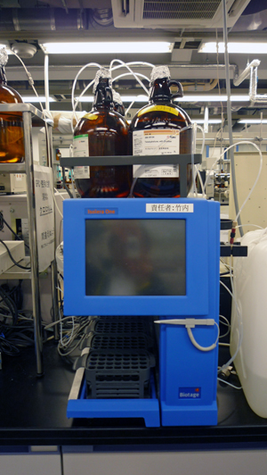 | 中圧クロマトグラフ (バイオタージ社製) TLCでの展開溶媒の分離条件を入力することで自動分取できる、ポンプからフラクションコレクターまで一体化した分取システムです。タッチパネルが非常に使いやすい。 |
