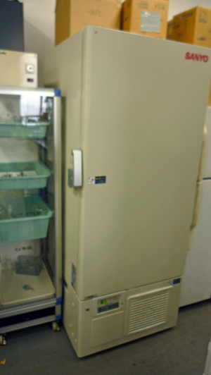 | ディープフリーザー −80℃まで冷却できる冷凍庫です。主にタンパクの保存に使用しています。 |
