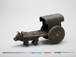 漢代には、中国の西北部の甘粛省武威磨咀子〔まそし〕漢墓から木製の彩色牛車が発見されているが、本品は陶製である。本品と類似した文物としては、河南省洛陽市邙山〔ぼうざん〕から出土したものがある(北京大学サックラー考古芸術博物館蔵)。高さ21.5cm、長さ41.0cmの北京大学所蔵品は西晋時代のもので、武士俑・犀形鎮墓獣とともに発見された。牛車は、漢代から晋代にかけて、一般的な貴族の移動手段の一つとなった。