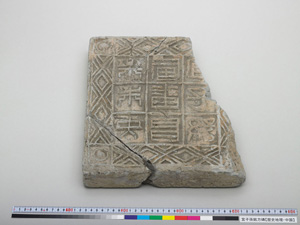 史料館番号:史料館93/『標本原簿』名称:漢宜子孫磚/『標本原簿』番号:68/製作地域:中国/製作時期:漢時代/陶製/32.5 cm×29.6 cm×5.8cm/数量:1点