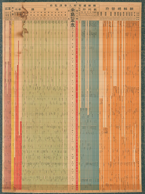 この史料は、昭和8年(1933)に朝鮮総督府人事課の監修により製作され、大陸研究社京城支社より刊行されたものである。朝鮮総督府が設置された明治43年(1910)から昭和8年にかけて、朝鮮総督府および附属官署などに所属していた高級官僚らの氏名および在任期間が1枚の表にまとめられ、軸装が施されている。