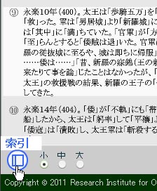 - 左下の「索引」ボタンを切り替えると、釈文を表示・非表示を選択できます。