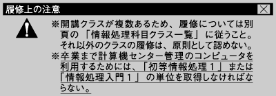 - 第一回目授業に必ず出席のこと。